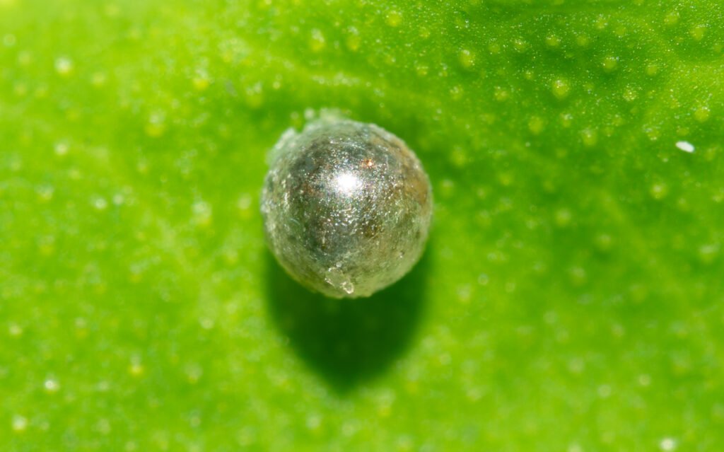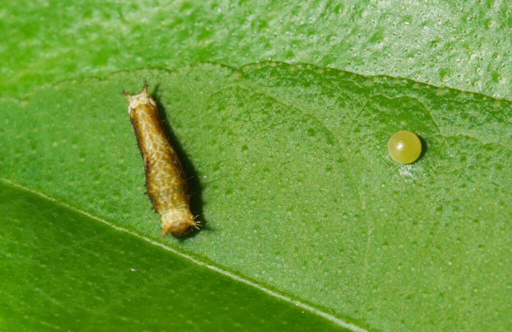 After hatching, the tiny caterpillar consumes part of the eggshell before feeding on the leaf. At this stage, it is extremely small and vulnerable.