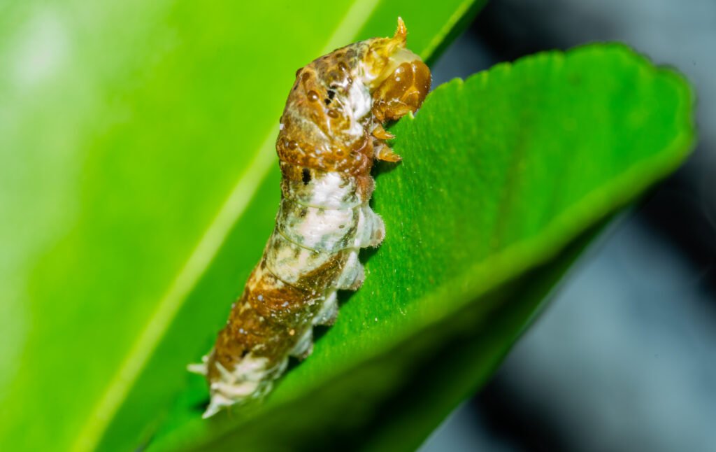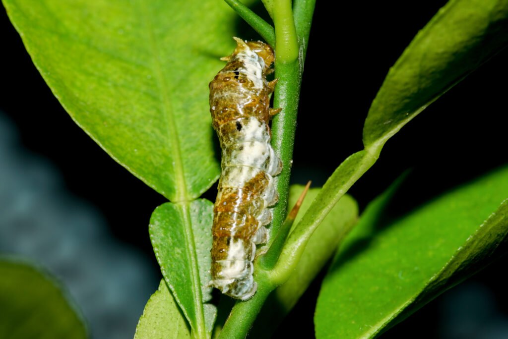 This camouflage is highly effective on lime leaves, where the caterpillar can remain unnoticed even when clearly visible.